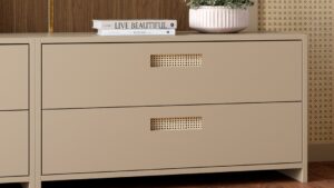 Outra forte tendência são os puxadores usinados com acabamento em palha natural que unem praticidade e elegância em um único detalhe. Ele adiciona textura e aconchego aos móveis, criando uma estética sofisticada e ao mesmo tempo acolhedora. Perfeita para quem valoriza ambientes modernos com um toque natural.